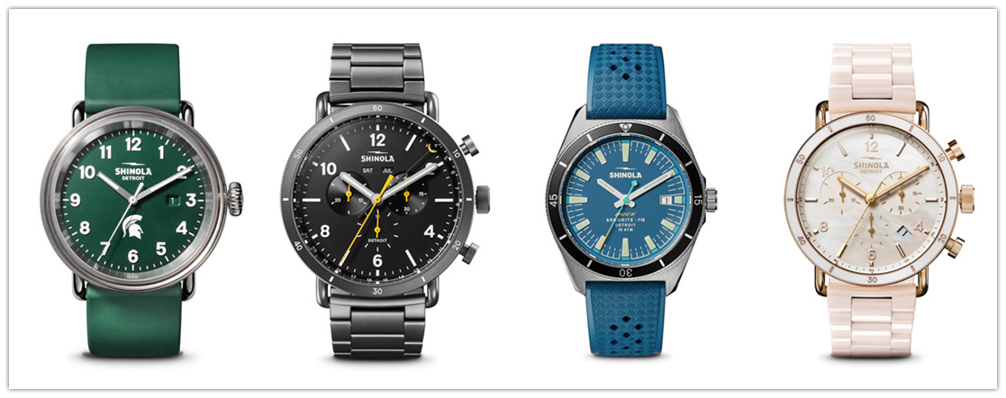 The Canfield is another elegant watch that works well with a smart casual or formal outfit. Made with mostly chromed elements, the watch features a blue dial and a metal band. The model uses a thin bezel and comes in a luxurious wooden box.